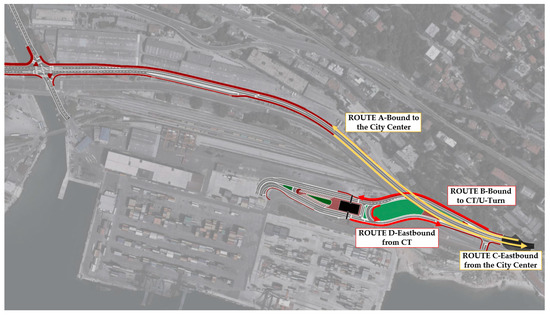 Figure 3): Route A—bound to the city center, Route B—bound to the CT/U-turn, Route C—eastbound from the city center, and Route D—eastbound from the CT. The focus is put on traffic mixed flows on routes A and B (HDVs and other vehicle categories traffic). On Route B there is also a Terminal Gate control point where HDVs need to wait for security reasons and where check control takes place. The time at the Terminal Gate directly affects the traffic and performance of the traffic flow on the main east-west city corridor. The time at Gate varies depending on the type of containers arriving at the CT (full or empty). Field research has shown that the average time at Terminal Gate for HDVs with a full container is 120 s with a standard deviation of 30 s, and for empties, 30 s with a standard deviation of 10 s. It was observed that the backward queue is formed in a specific situation with a length near to 335 m. That is the maximum length of the approach road heading to CT, which means that congestion may likely occur in the westbound direction toward the city center area (