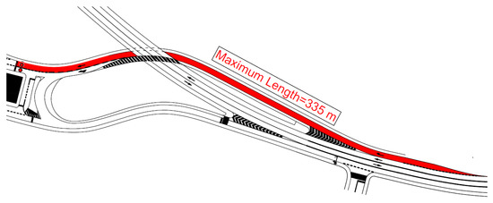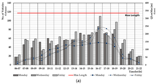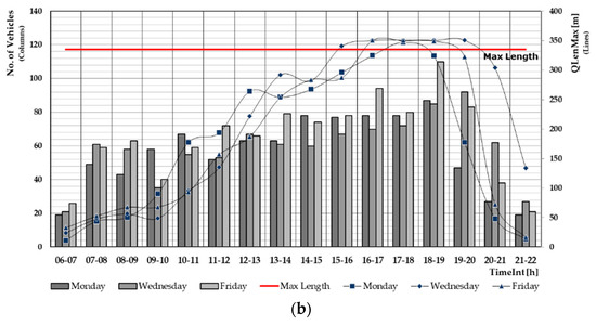 Figure 9 show traffic situations on the approaching road or Route B, where the queue forms during peak hours. This queue is the most significant in the future demand scenario due to the increased number of HDVs given the higher terminal throughput. In some cases, Maximum Queue Length exceeds the traffic lane’s length, causing congestion and blockage of traffic. That situation was observed several times on Mondays (three times between 15–20 h), on Wednesdays (five times between 15–20 h), and on Fridays (three times on intervals between 16–19 h). In all cases, the Maximum Queue Length was over the length of the approaching road, which is 335 m. It should be noted that total traffic volume and the number of vehicles in