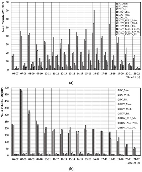 Figure 6a shows results from detector MQ04P which counts vehicles entering by approaching the road to CT or making a U-turn. Periods from 16.00–18.00 h have the highest volume of traffic, especially HDVs traffic. Results from the detector MQ01P are shown in