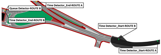 Figure 7). Time detectors include “start” and “end” virtual objects positioned at the cross-section of lanes heading toward the city center and on approach lane toward CT. Thus, it is possible to obtain the delay in travel time resulting from extensive traffic of HDVs and the limits when it is likely to occur. Queue detectors are set up near the Terminal Gate, where they can measure a backward queue on an approach road (lane). The simulation results are values of the variables or model outputs as follows: