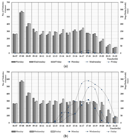 Figure 9a,b, where the Stop Delay Time is considered as a measure of time lost during the travel. Accordingly, all vehicles before the junction are affected, but the most significant effect is on the vehicles on Route A, the main corridor for entrance into the city. For the current situation (basic demand scenario), there is no significant time loss caused by congestion, and only a minor delay can be observed, which in some cases overlaps with terminal peak-hours traffic. However, for the future demand scenario, there is a high increase in delay during the same period. The cause of such a condition is not only the increase in traffic flow during peak-hours but also an overly long queue on the connecting road heading to CT. That can be concluded from simulation runs and post-simulation results.