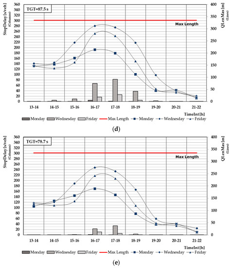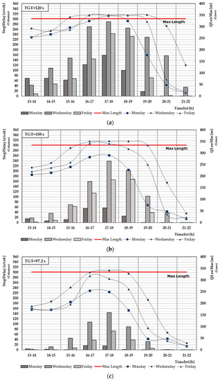 Figure 10a–e. It can be spotted that maximum recorded values of Stop Delay and the values of Maximum Queue Length coincide in each selected date. Due to the high values of Queue Length above the red line border, the stop of the flow occurs more often, resulting in significant delays if initial values of TGT are applied. After the first variation (10% less time on the gate), Stop Delay is reduced, but the value is still between 160 and 240 s on average per vehicle, recorded on Wednesday. Each subsequent variation shows a decrease of Queue Length and Stop Delays, but variations 3 and 4 assure Queue Length below the red border and practically very rare delays caused by stalled traffic flow. However, that is only a theoretic view on problem-solving. Feasibility of such a reduction in gate control time is doubtful, and it would require additional tests, including in-terminal flow analytics and impacts of terminal capacity constraints.