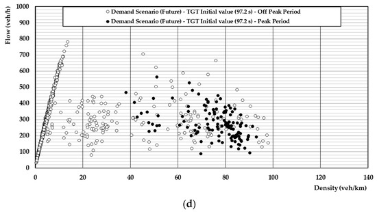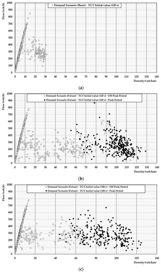 Figure 11 shows traffic flow and density values in different demand scenarios and variations in TGT. The significant degradation in traffic flow can be observed in case of increased transport demand on CT, especially during peak hours where the traffic condition switches toward the unstable area of the diagram. Changing the TGT policy may contribute to a reduction in congestion but eliminate the effects on traffic flow during the peak periods.
