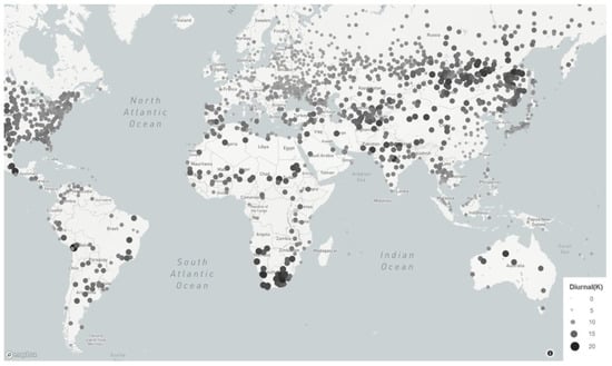 Global annual diurnal temperature range for 1,164 stations computed from the NCEI/NOAA weather database available at https://www1.ncdc.noaa.gov/pub/data/ghcn/daily/. The dataset contains daily air temperature data (max, min, average) from years spanning 1944 to 2016, though not all stations contain multi-year records. We observe that countries in Asia, Africa, the Middle East, and South America generally show large diurnal variations, though there are large gaps in geographical coverage for these regions.