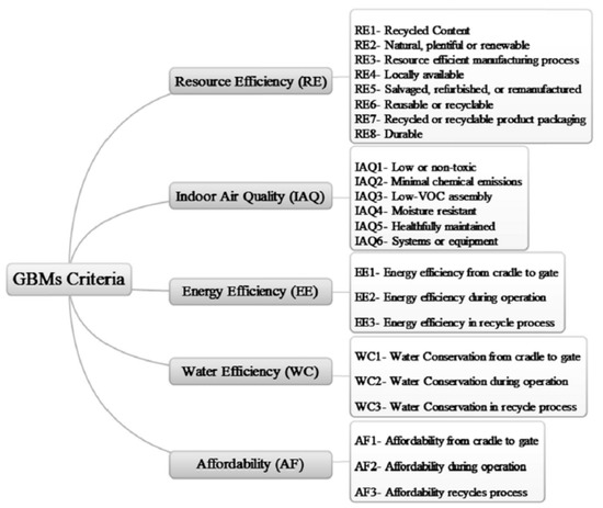 GBM selection criteria must be identified in decision-making problems regarding GBMs. Various studies have been conducted to do so [14,27]. For instance, in one study in 2018, GBM selection criteria were identified and categorised into five main groups including affordability (AF), water conservation (WC), energy efficiency (EE), indoor air quality (IAQ) and resource efficiency (RE) [12].