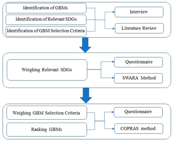 To weight GBM selection criteria, Questionnaire B was exploited. Each specialist was asked to complete the questionnaire according to their own knowledge and experience, and the scores were analysed by the COPRAS method. As mentioned before, due to the beneficial nature of SDGs, sums of normalised values for non-beneficial criteria did not exist in this study. Therefore, the sums of the weighted normalised values for beneficial criteria (pi +) were computed and are illustrated in Table 9. Priority values, as well as the quantitative utility of GBMs, were also calculated and are presented in Table 10.