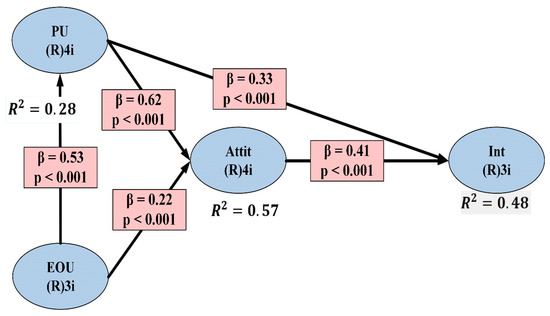 All coefficients of the composite reliability exceed the recommended minimum threshold of 0.6 [67], having values between 0.915, in the case of the variable “perceived usefulness”, and 0.938 in the case of “attitude”. As with the Cronbach’s Alpha coefficients, the composite reliability coefficients indicate a good consistency of measurements.