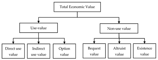 The non-use value can be classified into bequest value—where individuals attach value from the fact that the ecosystem resource will be passed on to future generations; altruist value—where individuals attach values to the availability of ecosystem resources for others in the current generation; existence value—the value of the existence of an ecosystem resource, even if a person has no actual or planned use [24]. The TEV classification can be seen in Figure 1. The use and non-use values configure the total economic value of services provided by an ecosystem [21]. The value of environmental services contributes to human well-being or welfare.