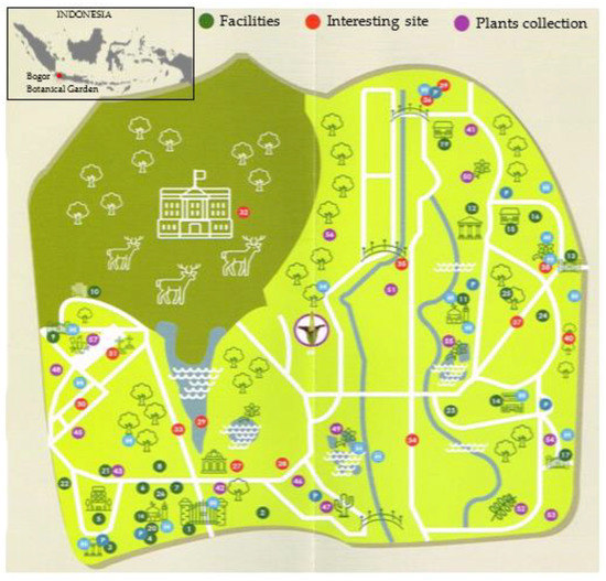 - BBG Authority. Map of Bogor Botanical Garden; BBG Authority: Bogor, Indonesia, 2020. [Google Scholar]