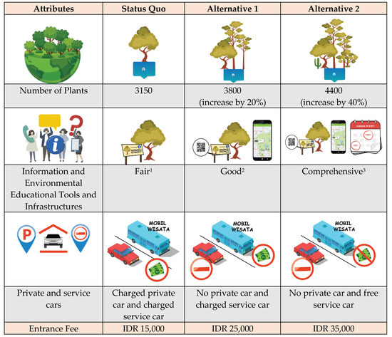 The CM is not only able to estimate the value of certain attributes of an environmental service but is also able to generate a value of a set of attributes with a certain level of attributes scenario. In this case, CM can provide values of several scenarios that may represent several levels of environmental improvement. Referring to [14], conducted using CM, the study estimated the value of improvement for the University of Kentucky Campus Arboretum. Using five attributes that are expected to be a source of income for improvement, the construction of a pollinating garden came up as the attribute with the highest value. Other examples of how CM can be used to estimate the values of environmental improvement scenarios are represented in [28,29] for conservation and in [30] for aesthetic landscape. In the case of BBG, it is possible to set several policy recommendation scenarios that generate different levels of improvement in the BBG’s management and make the value of the attributes become the basis of generating income for improving BBG.