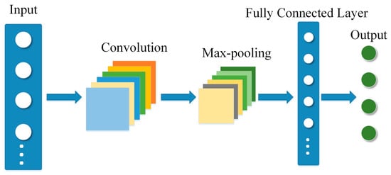 Convolutional neural networks (CNN) are feed-forward neural networks with two features of parameter sharing and sparse connecting, which can effectively capture characteristics of original data [] CNN has good image processing performance and is a classic model of deep learning applied to image data classification and recognition. Some researchers now use one-dimensional CNNs to process sequence data. Compared to traditional neural networks, it introduces convolutional layers and pooling layers. The input data is compressed and important features are extracted through the convolution operation. And the Max-pooling layer aims to reduce the size of the feature map to grasp features and diminish the computational cost. Figure 1 shows the structure of CNN: