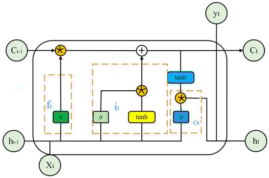 In the process of internal learning and training of traditional RNN, there will be a phenomenon of gradient disappearance and explosion, which makes it difficult for the model to train efficiently. To overcome this shortcoming, Hochreiter and Schmidhuber proposed a recurrent neural network in 1997, namely Long Short-Term Memory (LSTM) model []. The inherent storage unit and gate mechanism of LSTM effectively solve the defects of the RNN neural network model and save the delay event in the time series and the past information is effectively used to forecast []. LSTM is mainly composed of three threshold unit modules, which are divided into forget gate, input gate and output gate, its unit structure is shown in Figure 2. The LSTM model processes time series data from left to right in turn. The control switch of forget gate is used to determine the proportion of valuable information. The update process of cell unit depends on the input of the current moment, the output of the previous time and the historical memory information. The cell gets the current time information through the output gate. The information update status of cells and gates is shown in Formulas (7)–(12).