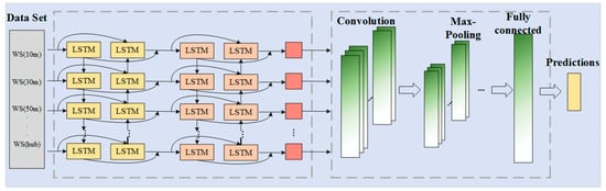 In order to overcome the shortcomings of single LSTM or CNN model and combine the advantages of them to get a better prediction effect, hybrid models based on LSTM and CNN are proposed in different areas []. Taking the hybrid model of CNN and LSTM as an example, Wang et al. [] came up with an online reliability time series prediction method based on deep learning models CNN and LSTM. The proposed model can process large-scale data, as well as predict online reliability time series data effectively and accurately. Bao et al. [] proposed a spatio-temporal deep learning architecture to predict the citywide short-term crash risk, by employing the CNN to capture the spatial dependencies and applying the LSTM neural network to capture the temporal dependency, finally, developing convolutional long short-term memory neural network (ConvLSTM) to capture the spatio-temporal features. The results showed that the proposed approach outperforms other models. Wen et al. [] proposed a spatio-temporal convolutional long short-term memory neural network extended (C-LSTME) model to encompass the spatiality and temporality of the air quality data and integrated meteorological data and aerosol data for predicting air quality concentration. The results showed that the performance of the present model has been improved. Liu et al. [] used wavelet transform algorithm to decompose the original data into two kinds of data with different frequencies, then utilize CNN to extract the feature from high-frequency data and LSTM to extract the feature from low-frequency data. Compared with other machine learning models (SVM, BPNN, GRNN, etc.), the performance of the hybrid model was verified, including the accuracy and robustness in wind speed forecasting. Therefore, it can be concluded that the combination of CNN and LSTM model to respectively capture the spatial dependencies and temporal dependencies has its unique advantage in solving the forecasting problem with a bulk of data characterized by temporal and spatial correlation features.