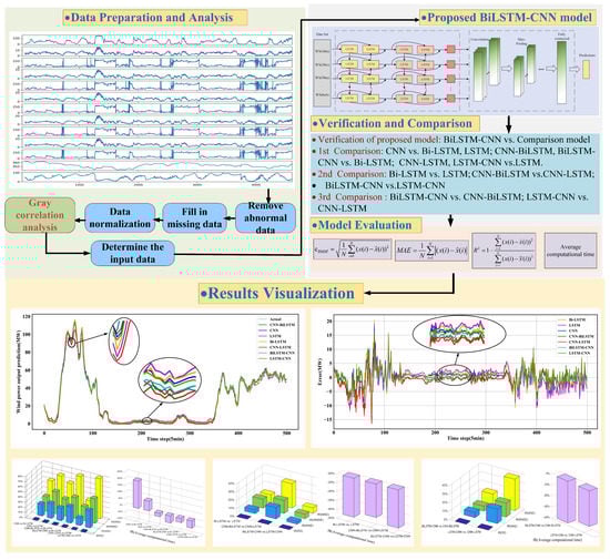 The purpose of this article is to predict wind power based on better robustness and accuracy. According to the above analysis, both BiLSTM and CNN have their unique advantages. Bi-LSTM can learn long-term temporal dependencies in bidirectional ways while CNN can better mine time-invariant spatial features of data. Therefore, a hybrid model based on Bi-LSTM and CNN is proposed to learn the temporal and spatial features among the data to better predict the short-term wind power output. In the mixed BiLSTM-CNN model, the upper model is Bi-LSTM learning temporal dependencies, while the lower model is CNN- mining time-invariant spatial features of data. The structure of the proposed model is shown in Figure 4. The framework of the case study is shown in Figure 5.