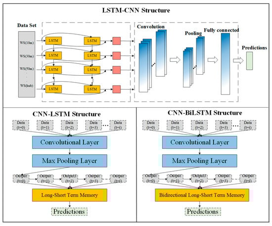 Step3: Validation, comparison and visualization of results. In order to verify the performance of the proposed BiLSTM-CNN model in this paper, three single deep learning models (BiLSTM, LSTM, CNN) and other hybrid deep learning models (LSTM-CNN [], CNN-BiLSTM [], CNN-LSTM []) are also conducted as comparison models for short-term wind power output prediction. The overall structure of the three hybrid models LSTM-CNN, CNN-LSTM and CNN-BiLSTM are shown in Figure 6. The comparison between different models from various aspects is also conducted. The indicators used to compare model prediction accuracy and efficiency are RMSE, MSE, MAE, R2, Average computational time(s). In order to avoid contingency and increase the reliability of the model, further research chapters are added.