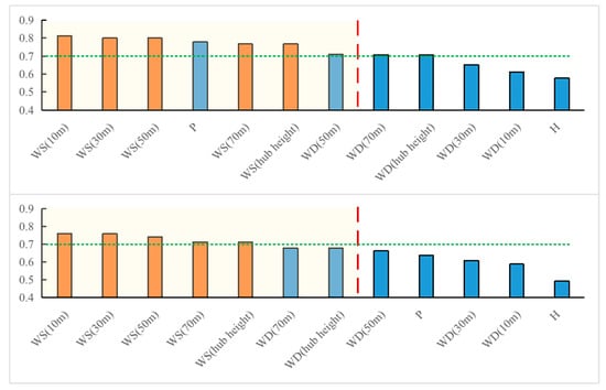 The results of grey correlation analysis under two different normalization methods are intuitively depicted in Figure 7 in descending order. The results show that the two different normalization methods lead to different ranking results. The top three indicators of the two ranking results are the same, namely, wind speed (10 m), wind speed (30 m), wind speed (50 m). And the last three indicators of two ranking results are also the same, namely, wind direction (30 m), wind direction (10 m), humidity.