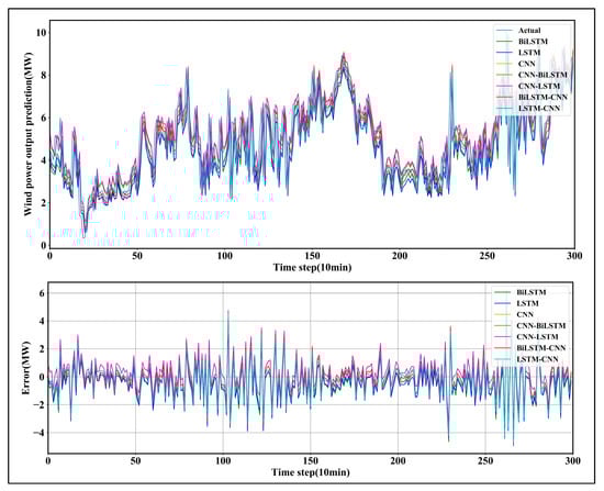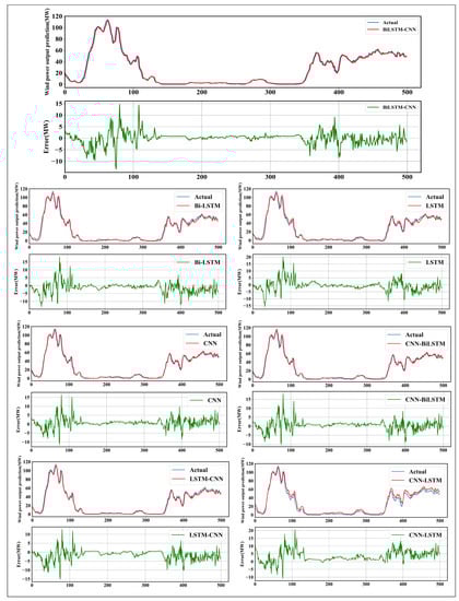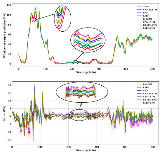 In order to verify the performance of the proposed model, three basic deep learning models (Bi-LSTM, LSTM, CNN) and three combined deep learning models (LSTM-CNN, CNN-BiLSTM, CNN-LSTM) are applied in short-term wind power output prediction as a comparison. All models are based on the same data set. The results of the proposed model and the comparison model are shown in Table 4 and Figure 9. To demonstrate the difference more intuitively among models, the more detailed forecasting results of each model are shown in Figure 10. The prediction result graph and the error comparison graph are separately enlarged shown in Figure 10.