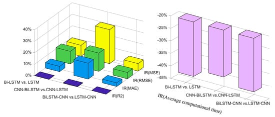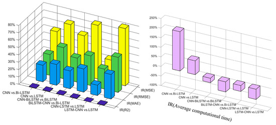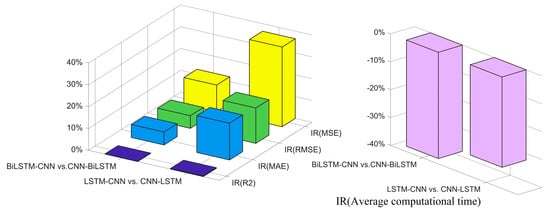In order to better determine the effectiveness of extracting spatial features through CNN in short-term wind power prediction, we introduced the following model comparison group: CNN vs. Bi-LSTM, CNN vs. LSTM, CNN-BiLSTM vs. BiLSTM, BiLSTM-CNN vs. Bi-LSTM, CNN-LSTM vs. LSTM and LSTM-CNN vs. LSTM. The comparison results are shown in Table 6 and Figure 11. Among the three single models, CNN has the best performance and the fastest running speed with the lowest RMSE of 2.7343, MSE of 7.4766, MAE of 1.8983, average computational time of 0.0741 and the highest R2 0.9918. Compared with Bi-LSTM and LSTM, CNN has higher prediction accuracy and faster average operation speed, with IR (RMSE), IR (MSE), IR(MAE), IR(R2) and IR(Average computational time) all positive value.