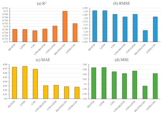 Compared with the model CNN-BiLSTM, the improved ratio of RMSE, MSE, MAE, R2, average computational time of BiLSTM-CNN are 5.93%, 12.22%, 5.79%, 0.09% and −38.08%, respectively. Compared with the model CNN-LSTM, the improved ratio of RMSE, MSE, MAE, R2, average computational time of LSTM-CNN are 16.84%, 36.52%, 16.20%, 0.28% and −32.38%, respectively. From the results of the comparison, it can be concluded that BiLSTM-CNN has a higher prediction accuracy and a lower computational speed than CNN-BiLSTM; LSTM-CNN has a higher prediction accuracy and a lower computational speed than CNN-LSTM. To attain a higher prediction accuracy, it is better to ‘extracting the temporal characteristics of the input historical sequences first and extracting the spatial characteristics second’ than ‘extracting the spatial features among the input historical sequences first and then extracting the temporal features’.