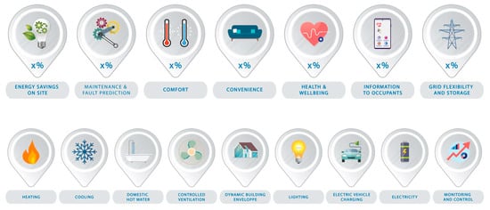 A precursor of the SRI was the energy flexibility, which is defined as the potential for using a building for demand response [10]. In 2017, a discussion between the study “Support for setting up a Smart Readiness Indicator for Buildings and related impact assessment” and the International Energy Agency (IEA) EBC Annex 67 concerning the Energy Flexible Buildings was established. The initiative of the IEA would provide support to the EU study concerning SRI. It is, however, foreseen that Annex 67 of the IEA framework for energy flexible buildings labelling will differ from the Smartness Indicators of the EPBD [11]. Junker et al. [12] presented a dynamic methodology for the definition of the energy flexibility of buildings, entitled flexibility function. The methodology was tailored for the requirements of the IEA Annex 67, but the authors claimed that this study could be a cornerstone for the SRI methodology.