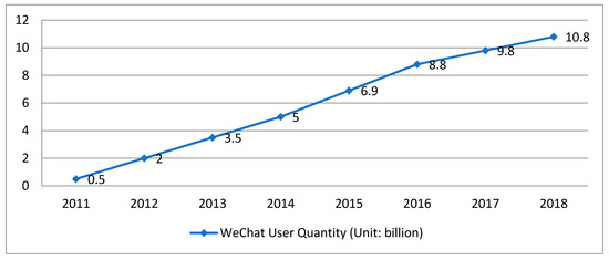 Chinese mass media such as the People’s Daily Online and Xinhua have promoted the spread of CSR in society by holding CSR forums, giving out CSR awards, and reporting on outstanding CSR practices. Meanwhile, the popularity of smartphones has produced the era of mobile Internet. As Figure 1 shows, the number of mobile netizens has been increasing since 2008, exceeding 500 million in 2013 and exceeding 800 million in 2018. The share of mobile netizens in the netizen population increased rapidly from 39.5% in 2008 to 80% in 2013, and then rose steadily to 98.6% by 2018. Figure 2 shows that the number of WeChat users has been rapidly increasing since it launched in January 2011. It has become the most widely used messenger platform in China. In this environment, new ways of spreading news, called “we-media,” have emerged. The official WeChat account was developed in 2013 and is now the most-used we-media in China. Media platforms, companies, and individuals can all publish articles through WeChat’s official accounts, and the Chinese have become used to watching news through WeChat. Such advances in technology have greatly promoted the spread of CSR among the Chinese public.