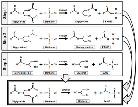 The production of biodiesel is characterized by catalyzed transesterification (Figure 1 and Figure 2) with alcohol (most likely methanol), together with a catalyst to improve the reaction rate and yield [17]. The main by-product of the production of biodiesel is crude glycerol which is 10 percent of the raw weight of the initial substrate [9,10]. Contents of crude glycerol are glycerol, alcohol, water, salts, soapstock, heavy metals, free fatty acids, mono, di- and triglycerides, and methyl esters [10,18,19]. The concentration varies depending on the source of oil (animal or vegetable) and the used technology for biodiesel production [19].