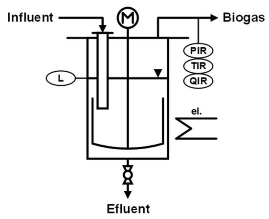 Two experimental units with four identical custom-made fermenters (Figure 3) per unit with a working volume of 20 L were used. Each fermenter was equipped with a milligas counter (Ritter MGC 1), and the biogas yield was continuously recorded by the data acquisition software RIGAMO (Dr.-Ing. RITTER Apparatebau GmbH & Co. KG, Bochum, Germany). Furthermore, the biogas was collected in gas collection bags, and the gas composition was measured several times per week with a gas analyser Visit 03 (Messtechnik EHEIM GmbH, Schwaigern, Germany). The components methane (CH4), carbon dioxide (CO2), hydrogen sulfide (H2S), and oxygen (O2) were measured. The components methane and carbon dioxide were measured by infrared spectrometry, and electrochemical sensors were used for hydrogen sulfide and oxygen. The process temperature under mesophilic conditions was regulated by circulating fresh air from a heater. All fermenters were capsuled by an insulation system. The liquid phase of the digester had a semi-continuous stirrer connected to an anchor stirrer with variable rotation per minute and stirring intervals. Depending on the daily feed, the hydraulic retention time was set at 29 days in unit A and 24 days in unit B. Every unit was fed with a defined mixture of biowaste and crude glycerol from diesel production. The digester was fed and purged by hand two times every day via a feeding tube extending from above to below the filling level. The fermentation residues were also removed manually via a ball valve at the bottom. During the weekend, the fermenters were not fed; as a result, a decrease in specific gas production over the weekend could be expected.