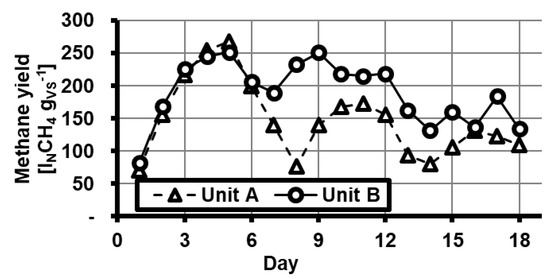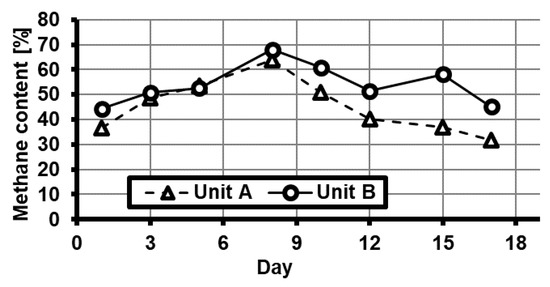 The methane content in biogas during the experiment ranged from 31.6% to 69.9% (Figure 5). Furthermore, the maximum methane content in biogas was reached after one week in both units. The minimum methane content was reached after 17 days. The decreasing methane content was associated with a decreasing gas yield. The average methane content of unit A can be found under the average methane content of unit B, depending on the organic loading rates of units A and B.