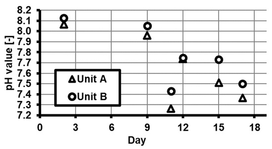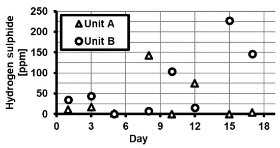 Sulfur is essential for the growth of microorganisms. Undissociated hydrogen sulfide inhibits the growth of microorganisms. In a stable digestion process, a balance between hydrogen sulfide and the dissolved sulfides can be found. A decreasing pH value shifts the balance in favor of hydrogen sulfide [41]. Between day 1 and day 17, it was visible that the concentration of hydrogen sulfide in biogas increased in both units (Figure 7). In unit B, the increase of hydrogen sulfide was much higher than in unit A.