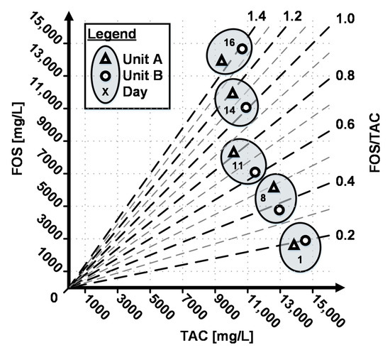 Volatile organic acids (FOS), buffer capacity (TAC), and FOS/TAC ratio.