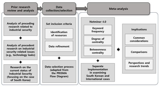 First, prior research on industrial security and related issues was analyzed. Data on relevant legislation and activities were then collected and assessed to clarify the current status of industrial security. Second, inclusion criteria were set to select accurate, meaningful data. Subsequently, selected data were identified and refined. After the final data selection, meta-analyses were conducted with Netminer V.4, which is commonly used for social network analyses. Using this software, we extracted the keyword frequency, degree of centrality and betweenness centrality to analyze the characteristics of—and relationships among—the relevant keywords. The South Korean and international data were separately examined to satisfy this study’s objective. Finally, comparisons and common considerations were analyzed to provide a central perspective on industrial security. Figure 1 below illustrates the research methodology.