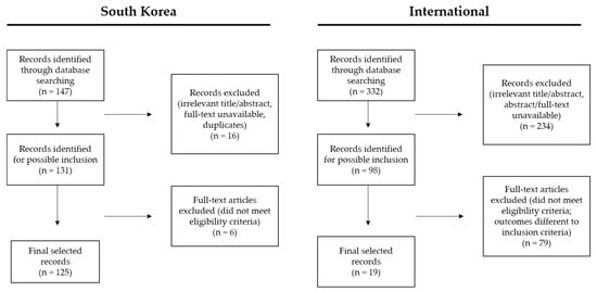 General verbs, unrelated nouns and prepositions were first excluded. Similar keywords, such as “leak” and “leakage”, were considered synonyms. Abbreviations were also regarded as synonyms, such as “IS” and “industrial security”, “HR” and “human resources” and “SMEs” and “small and medium-sized enterprises”. Finally, plural nouns were treated together with their singular forms, such as “experts” and “expert”. Keywords that satisfied the inclusion criteria were used to search the databases; consequently, 125 journal articles were found for South Korea and 19 journal articles for international journals. The data selection process was adapted from the Preferred Reporting Items for Systematic Reviews and Meta-Analysis, which is known as PRISMA flow diagram [26], as illustrated in Figure 2.