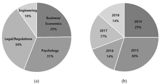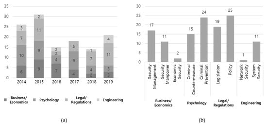 As mentioned in Section 3, this study has two research objectives that involve meta-analysis: to analyze and compare the trends and status of journals related to industrial security. Figure 3 displays the research trends in the industrial security field as well as the frequency of published papers by year in South Korea. We have analyzed the data manually by collecting and counting papers which were published during 2014–2019. Subsequently, we gathered the opinions from industrial security experts and conducted a classification. The left panel (Figure 3a) illustrates the research trends classified by area: business/economics, engineering, legal/regulations and psychology. Legal/regulations comprises the largest portion of all trends, or 34%; this reveals the importance of enacting industrial security-related laws. Psychology is ranked second at 25%, which indicates the increased number of security incidents related to human factors. This is followed by business/economics, which indicates industrial security needs in the business field—including industrial or core technologies—and represents the importance of the economic benefits gained from protecting technologies. Finally, engineering is ranked last, as technical or information-related security is considered “information security”, which significantly differs from industrial security. The literature lacks well-defined concepts for each term [7], although studies focusing on the differences in these definitions have increased as industrial security research has expanded, providing corresponding results. The right panel of the figure (Figure 3b) illustrates the frequency of industrial security research published by year.