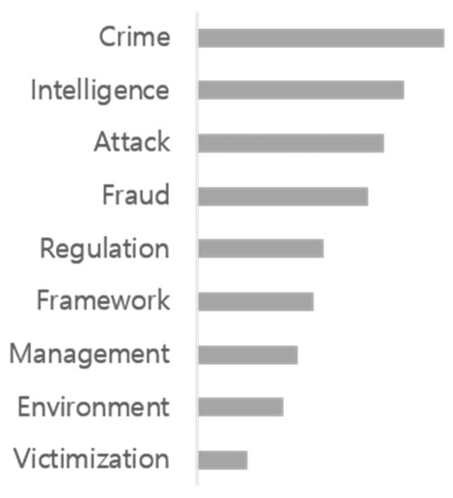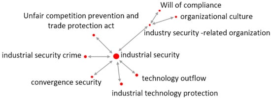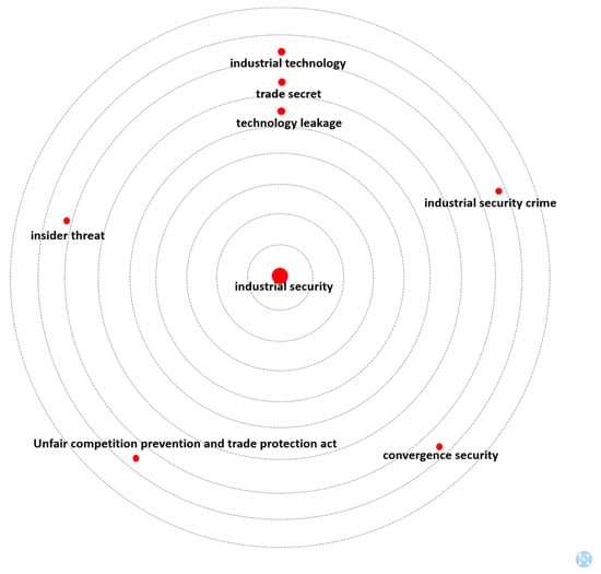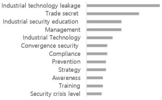 Keyword frequency is considered by the appearance degree in document. It referred as a density of association; the higher the density of association, the higher the appearance of related keywords. Figure 5 illustrates the keyword frequency, with the most frequently used keyword being “industrial technology leakage”—an issue often encountered in industrial security. “Trade secret” is the next most frequent keyword, which indicates the industry’s emerging need to defend against illegal security incidents as well as the importance that South Korea places on the associated laws and regulations to handle the issue on a global level. This is followed by “industrial education”, or education in terms of both providing a well-constructed curriculum and relevant security-related programs. Next, “management” refers to organizations’ need for security management at the employee and executive levels. “Industrial technology” and “convergence security” follow, which refer to the stability and importance of tackling industrial security issues. Then, “compliance” demonstrates the importance of organizational members’ participation in industrial security. “Prevention” and “strategy” follow, which indicate the importance of identifying preventive countermeasures. “Awareness” represents the overall knowledge regarding industrial security that can help deter problematic security incidents, such as insider threats. The “training” of industrial security experts or employees is also an important keyword. Finally, the keyword “security crisis level” reveals that the industrial security field largely includes studies on how to properly evaluate levels of security.