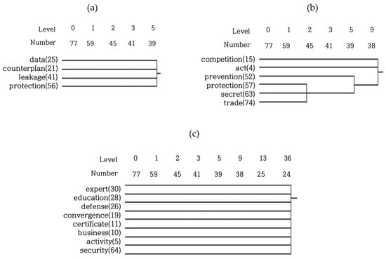 The result identified the pairs of [data, counterplan, leakage, protection], [competition, act, prevention, protection, secret, trade] which is a combination of cluster and word and [expert, education, convergence, certificate, security…] as a main pairs. Figure 8 is an image of particular part extracted from the original result for clarified visualization. The original dendrogram result is presented in Figure A3 in Appendix A. The first pair which refers to Figure 8a, indicates not only technology but also leakage incident continuously occurs and therefore need a protection toward organizations’ assets. Also, in the field of industrial security, the appearance of “protection” and “counterplan” is reasonable, but the appearance of keyword “data” was notable. It can be construed as unlike information security which territory-centric, industrial security focuses on the needs of data-based security system. Second pair which refers to Figure 8b indicates that securing industrial technologies and developing a counterplan have a similar contextual meaning to enacting acts or laws to prevent leakage incidents. The term protection refers to a proper noun particularly used in the law, not a repetition of the other “protection” appeared in previous pair. Moreover, “trade” and “secret” was the most appeared keywords which indicates the importance of technology transfer and confidential management which lead to the practice of technology transfer based on agreement with each interested parties under secured environment. Last main cluster form which is presented in Figure 8c shows that many industrial studies focus on security education, as the importance of creating experts to proactively response against leakage incidents is being stressed which meets the intention of conducting this research. It also emphasizes that the research topics focuses on aligning security with business and conduct converged countermeasures and particularly suggest the necessity of security education for cultivating security experts.