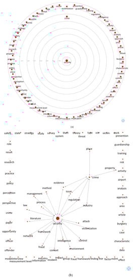 The results imply that “crime” has a highly relevant relationship with security as illustrated in Figure 10. Various keywords, such as “theft”, “victimization”, “burglary”, “airport” and “guardianship”, represent the perspective toward security, in which a systematic concept for and range of industrial security has not yet been established. With “security” and “crime” as the highest nodes, “evidence”, “regulation” and “attack” share a common relativity. These results also reveal that international studies reflect physical and private security as a part of industrial security, which must be distinguished and considered separately. This also addresses the scarcity of industrial security-related research.