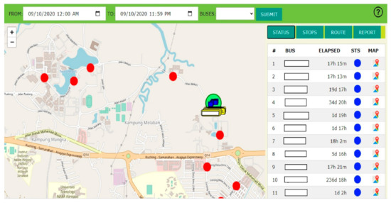 - Akter, S.; Islam, T.; Olanrewaju, R.F.; Binyamin, A.A. A Cloud-Based Bus Tracking System Based on Internet-of-Things Technology. In Proceedings of the 2019 7th International Conference on Mechatronics Engineering (ICOM), Putrajaya, Malaysia, 30–31 October 2019; Institute of Electrical and Electronics Engineers (IEEE): Piscataway, NJ, USA, 2019; pp. 1–5. [Google Scholar]