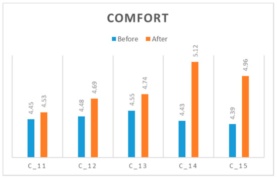 | Comfort | 4.46 | 0.88 | 4.81 | 1.25 | 0.35 | 2.62 | p < 0.01 |
