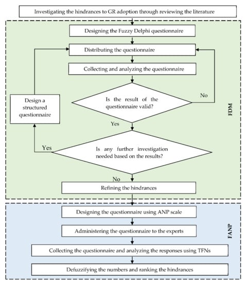 This research is conducted in three stages: (1) literature review; (2) identifying and refining the hindrances to adoption of GR using FDM; (3) prioritizing the selected hindrances to the adoption of IGR and EGR separately using FANP. The steps taken to achieve the aim of the research are shown in Figure 1 and discussed as follows.