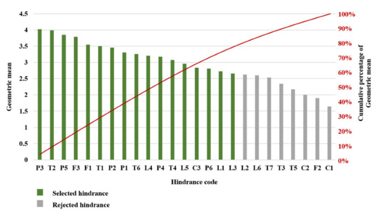 where indicates the appraisal value of the ith expert for hindrance A, and i denotes the ith expert; i = 1, 2, …, n. Once the GMs of all hindrances are calculated, the cumulative percentage of hindrances is determined in descending order. Those hindrances not contributing to 80% of the importance are rejected and not considered as a significant hindrance in GR adoption and are omitted from further analysis.