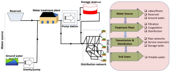 A conventional WSS is illustrated in Figure 1. It comprises of a water source, water treatment plant and pumping station, transmission mains and distribution networks, and end users. Each of these components is briefly discussed below.