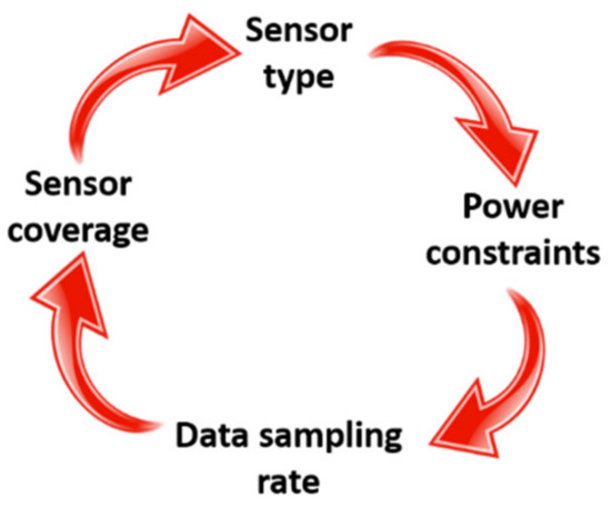 As illustrated in Figure 3, depending on the application domain, the deployment of sensors strongly depends on the sensor type, the power requirements, data sampling rates, and the sensor coverage. For large-scale infrastructure, such as water distribution networks, sensor coverage is a key issue. Also, since continuous measurement of flow rate and pressure along a pipe is required for leakage and water quality analysis, these data need to be sampled continuously, thus, the sensors must offer a high data sampling rate. Also, sensors and the sensor nodes are battery powered, raising concern about the power constraint since the sensors are to run uninterrupted for a very long period. These requirements make the study of CPS sensing systems a hot topic in the research community. Studies on sensor coverage [38,39,40,41] and improving the energy efficiency of sensor nodes [42,43,44,45,46,47] may be found in literature. With the latest progress in sensor technology, mmWave sensors [48] have been developed. These sensors provide multidimensional sensing with precise measurement in both range and velocity and are capable of penetrating certain materials such as plastic and drywall with good resistance to environmental conditions such as rain, fog, dust, and snow [48]. Though the technology is still at its initial stage, it is expected to be a perfect fit for monitoring large-scale critical infrastructure such as water distribution networks.
