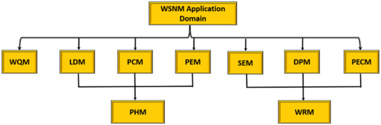 In this section, research papers reporting the application of CPSs in the water domain to monitor water system facilities are reviewed. As illustrated in Figure 6, we categorized the water supply network management (WSNM) application domain as water quality monitoring (WQM), leak detection and monitoring (LDM), pressure control and monitoring (PCM), parameter estimation and monitoring (PEM), state estimation and monitoring (SEM), demand prediction and monitoring (DPM), pipe health monitoring (PHM), pump energy consumption monitoring (PECM), and water resource management (WRM).
