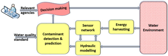 In an effort to address some of the challenges in those research studies and make the system robust, [26,102] incorporated a water quality hydraulic modelling into the system for contaminant prediction and detection. Wang et al. [26] proposed an architecture of a typical cyber-physical water system utilized for water pollutant detection. The proposed system consists of sensing devices (with water quality sensors) arranged in a sensor network, a hydraulic model, and energy-harvesting platform, as shown in Figure 7 [26].