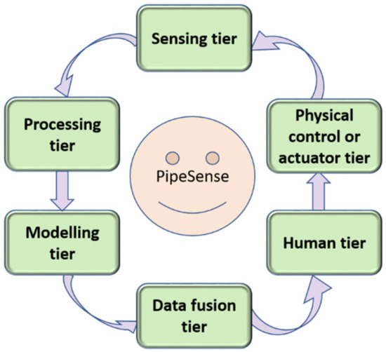 For autonomous monitoring, several sensors and actuators used in tracking the physical environment need to provide continuous measurements for a longer period, as such, they are arranged in a network mode connected by a wireless means. This is regarded as a wireless sensor/actuator network, which is a set of sensors and actuators that are dispersed and interconnected via wireless networks [34]. It is then possible for the CPS to sense, communicate, and execute the appropriate actions to alter the behavior of the physical environment. Conventional sensor and actuator nodes are provided with processing and wireless communication capabilities and a power source. Although actuator nodes possess greater computational and communication capacities and a higher energy budget compared to sensors [34], both are still faced with power constraint issues. Different sensors could produce enormous real-time data that need to be aggregated for further processing. Also, the wireless sensor networks use radio communication technology to relay the acquired data and their design for implementation in water supply network applications, such as pipeline leakage detection, relies on the environment in which the pipe is installed [35]. This is fundamental to selecting the type and positioning of the sensors. Sensors may be put inside the pipeline in touch with the water (known as invasive sensors) or as noninvasive sensors, where they are not in contact with the water inside the pipe [36,37]. The invasive sensor must, therefore, be robust to cope with the installed environment. It is a known fact that the sensor nodes are powered by battery, therefore, energy conservation is a key challenge that raises concern in the specification of sensor network for real-time pipe health monitoring, as illustrated in Figure 3 [4].