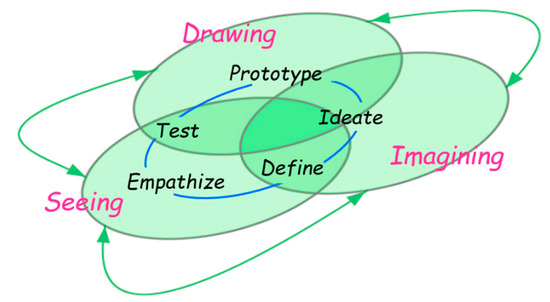 Design thinking has been described in the framework of visual thinking [13], as shown in Figure 1. The Empathize process begins design thinking as a part of Seeing. In Seeing, pain points and delight points with negative and positive values are identified. Seeing also includes a determination of target values and the scopes of problems. Problem defining would require many iterations of partial solution generation and problem interpretation as problems and solutions co-evolve [14]. Define corresponds to the overlap of Seeing and Imagining. The Ideate process of design thinking is the Imagining of visual thinking. Imagining would mean that even vague and premature ideas can be imagined, as these will be improved through the next iterations with Drawing and Seeing. New customer experience activities need to be generated, but also existing activities can be transformed. Imagining is evoked by the results of Seeing. Imagining also builds upon what’s been imagined in previous iterations of Seeing—Imagining—Drawing. Ideate is Imagining interacting with Seeing and Drawing. The Prototype process corresponds to Drawing in visual thinking, and Test belongs to Seeing. Note that the Test process is a part of the next iteration. That is, the visual thinking process is inherently iterative. Test may involve evaluations of potential customers. Note that evaluation criteria are those value themes identified in the Empathize process. In this way, the Test process is at the intersection part of Drawing and Seeing. The perspective of design thinking in the framework of visual thinking would make contributions in understanding design thinking both [15] as a descriptive model of the design process and as a prescriptive method of design and business innovation.