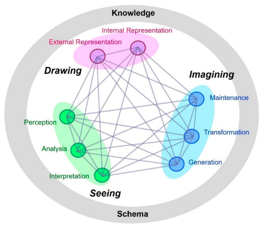 A visual reasoning model was developed to understand the cognitive process by describing the visual thinking process of Seeing—Imagining—Drawing with basic cognitive activities [16], as shown in Figure 2. Various visual reasoning abilities were observed and explained using the visual reasoning model [17]. Relationships between design creativity and the sketching process were studied using the visual reasoning model as an analysis tool to evaluate cognitive activities and creativity in design [18]. The visual reasoning model is now briefly reviewed. In the Seeing process, perception, analysis, and interpretation occur. The Imagining process enables us to synthesize using perceptual and conceptual information for new representation. The Imagining process has been classified as generation, transformation and maintenance slightly modifying [19]. Generation and transformation were proven to be critical in the creative design process [20]. Image maintenance occurs to keep the internal representation of generation and transformation. The Drawing process enables representation internally and/or externally. This process occurs in interaction with the Imagining and Seeing processes. In addition, knowledge and schema are engaged in interaction with the visual reasoning process. Schon suggested that empirical knowledge affects the iterative process of framing, moving, and reflection [21]. That is, retrieval of knowledge becomes a cue for perception in the Seeing process. By schema, information can be reorganized in the iteration process of Seeing and Imagining [22]. Visual reasoning is a linking process between perceptual and conceptual knowledge [23].