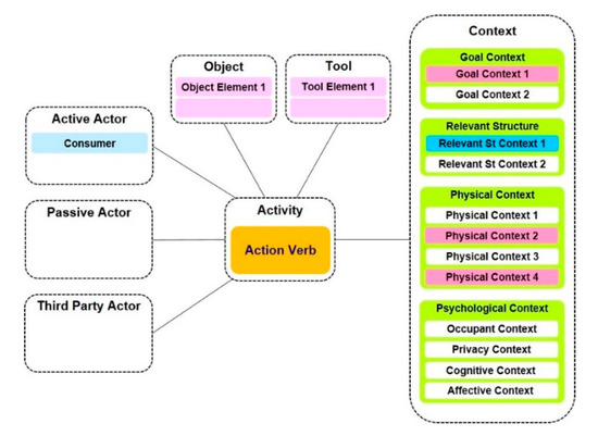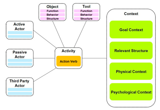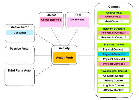 This section reviews the Context-Based Activity Modeling (CBAM) [27] to describe activities in detail. Its schematic diagram is given in Figure 3. The activity description is centered around the action verb. The object of the action is specified as the object element of the activity. The active actor is the subject stakeholder of the activity who performs the action. In some cases, the passive actor and/or the third-party actor are specified as well. The tool of the activity is specified when a tool is used in the action. Another element of the activity in CBAM is the context, which is in turn described by the following four context elements: The goal context, the relevant structures, the physical context, and the psychological context. The relevant structures are the entities associated with the object element in the action. The physical contexts such as location and time are specified. The psychological context such as emotional states and motivation level can be associated. In addition, whether the activity is public or private, and whether the activity is performed alone or with others can be specified as social context as a part of the psychological context. Through this rich description of activities as an underlying mechanism, diverse experience issues can be addressed in human activity-centered experience design. That is, CBAM is regarded as a basic underlying schema in service activity design. Those activities in service blueprints [35] are represented in detail using the CBAM method [38].