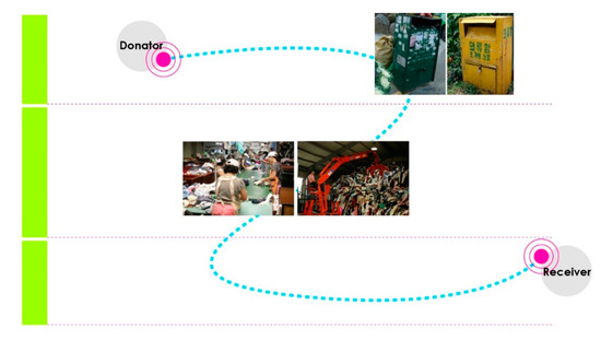 The current experience of used clothes reuse is well described by the journey map of donated used clothes shown in Figure 4. A donator user brings used clothes to a nearby collection bin, and gives used clothes using the collection bin as a tool. Then, those used clothes inserted in the collection bin are collected in bulks by a service provider as if they were trash. Some useful clothes are selected and sorted by laborious efforts of human service providers. Those used clothes that have gone through this journey are delivered to receivers who would wear them. This overall service process is represented in the as-is service blueprint. A simplified version of the service blueprint is shown in Figure 5. Note that this kind of service experience of used clothes donation dictates the major aspects of used clothes reuse culture. Such reuse culture gives significant influence on clothes use culture and practice as well.