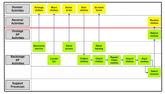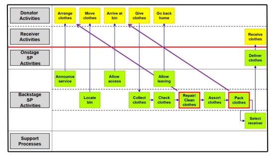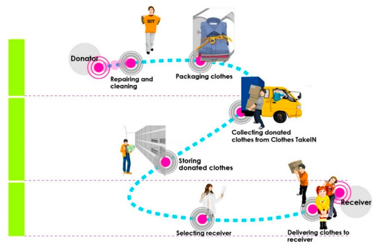 The service concept presented in the journey map of Figure 9, where donators take up many activities as an active actor, would need to handle a lot of issues including design of new physical touchpoints and design of a sustainable business model. However, behavior changes in the activity of giving used clothes as if they were given as presents could contribute not only to the donation service, but also to clothes reuse culture. Even though the ownership of used clothes and their use context are to be changed, reuse life of the used clothes can be better supported by transferring functions and structures of the clothes in decent ways. It would be desirable if donator’s experiences of using the clothes including information on the used clothes can be transferred together with physical material aspects of used clothes with efforts by the current user. In this way, the used clothes TakeIN PSS can contribute to the transformation of clothes reuse culture and clothes consumption practices. Note that the design for sustainability methods has evolved from the product innovation level to the product-service system innovation level, then to the socio-technical system innovation level [49]. The design for sustainable behavior efforts emphasized more of the consumer activities and behavior [50]. The evolution of the used clothes TakeIN PSS would develop as discussed above goes in parallel with the trend in design for sustainability and circular economy. This issue will be discussed further in the conclusion section of the paper.
